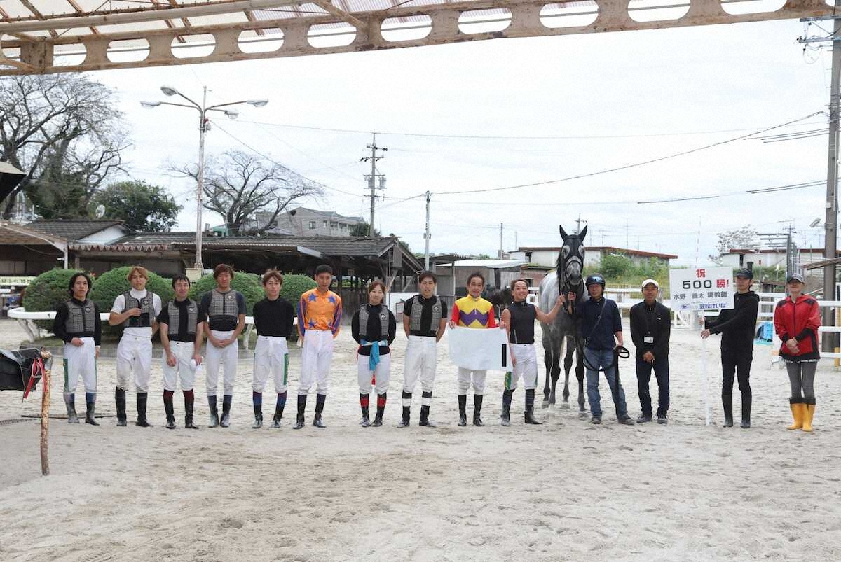 通算500勝を達成した水野善太師(右から3人目)=岐阜県地方競馬組合提供