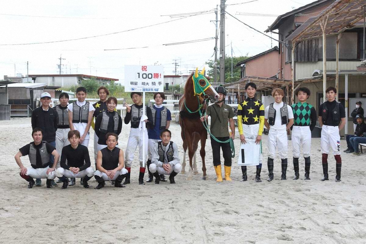地方競馬通算100勝を達成した明星晴大(右から4人目)=岐阜県地方競馬組合提供