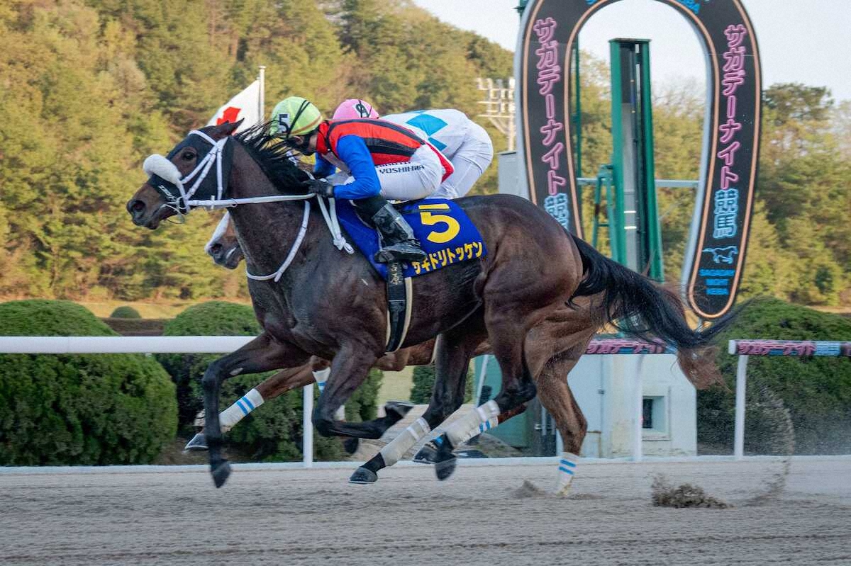 佐賀競馬の3歳牝馬重賞「第25回 ル・プランタン賞」(GRANDAME−JAPAN2026)が5日、6Rで行われた。1番人気サキドリトッケン(真島元、父トゥザワールド)が2周目の3角手前から位置を上げ、直線半ばで先頭へ。内から迫ったミスティライズを首差しのいで、重賞6勝目を飾った。